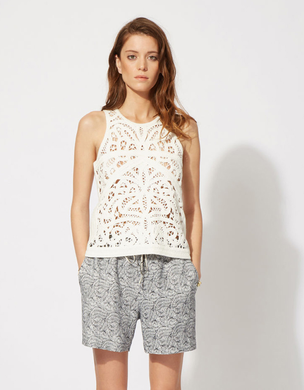 Vous pouvez aussi vous orienter vers une marque qui ne revendique pas cette relation avec effervescence colorée du festival, mais sais proposer des collections aux inspirations douces, aux modèles travaillés, et à la ligne décontractée. La marque Antik Batik vouspropose ausi un top ajouré sans manches dans sa version plus haut de gamme, en dentelle de coton rebrodé de perles. 100% coton.