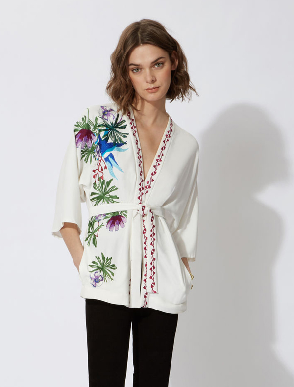 On trouve aussi un modèle original de Kimono imprimé fleurs Maje RAMSES. Il est doté de manches 3/4 raglans et de deux poches fendues sur les côtés. Le modèle est travaillé avec des broderies sur le devant et se ferme à l’aide d’une ceinture amovible. On est moins habitué à voir la rigueur et la discrétion japonaise se mêler avec l’exubérance libérée de la Californie. Mais l’usage de ce vêtement (souple, décontracté, confortable) s’adapte parfaitement avec le monde informel des concerts en pleine nature.Polyester 100%