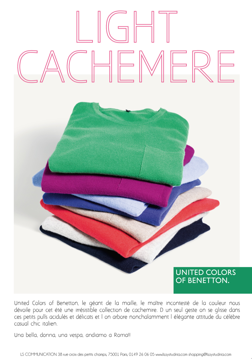 Le cachemire, on aime le porter. Souple, doux, il tient chaud. Benetton roi de la maille italienne, dont on se souvient qu’il milite pour un monde plein de couleurs et de diversité dévoile sa collection 2014 de cachemire. Même si on aime la laine, on ne peut que se laisse tenter par cette collection acidulée, en couleur unie qui nous permet nous les hommes d’adopter facilement ce style casual et chic du latin lover. Chez Benetton, on peut la choisir avec le col ras du cou ou en V ou avec une petite poche poitrine.