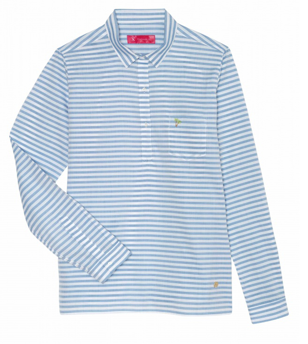 On apprécie la chemise 100 % coton, dont le style original s’exprime avec une discrétion de bon aloi, un peu aristocratique pop quoi ;). On retrouve les codes de la marque dont tous les revers sont contrastés avec des couleurs vives. Etre le pacha dans une tenue chic décontractée est un vrai plaisir. Vicomte A décline ses collections également pour femme et enfants. La marque propose pour la compagne du capitaine de bateau, un chemisier polo qui joue aussi sur les lignes horizontales et le bleu azur. Cela leur permet de contempler en duo et en harmonie la ligne fuyante de l’horizon.