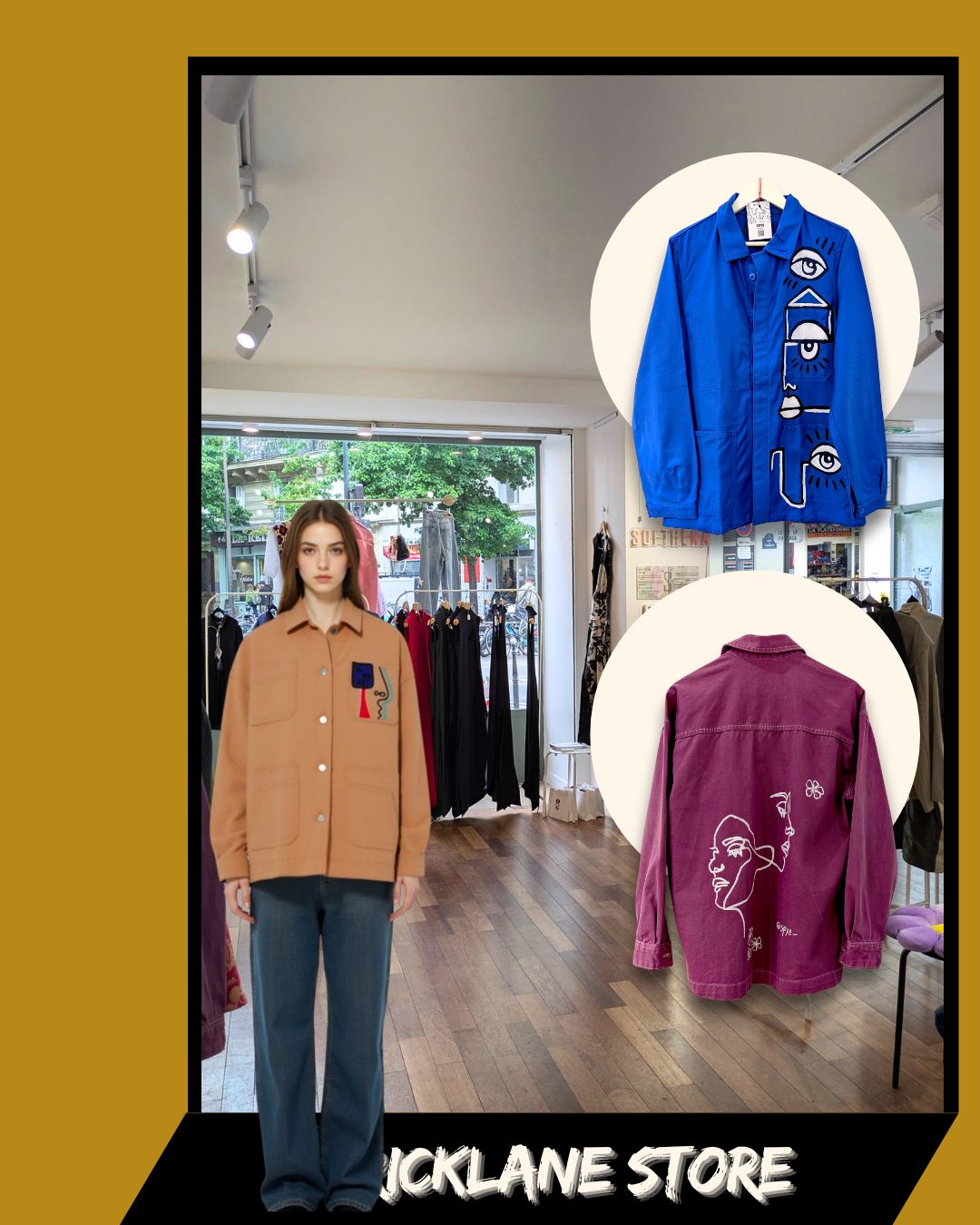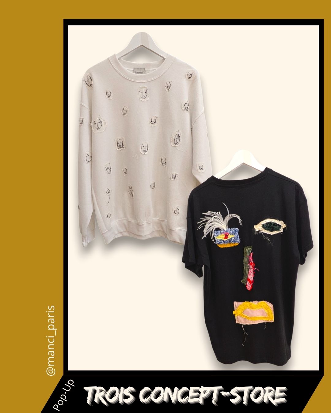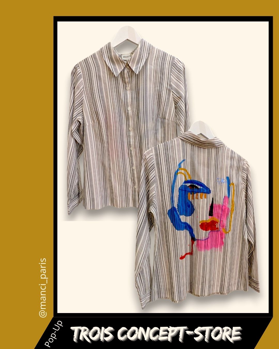 Manci propose des créations très personnelles sur des chemises, des t-shirts, des vestes qui sont chinées et upcyclées avec les propres créations en peinture mais également en broderie de la créatrice. Upcycling, fait main et pièce unique les rapprochent de l’oeuvre d’art.