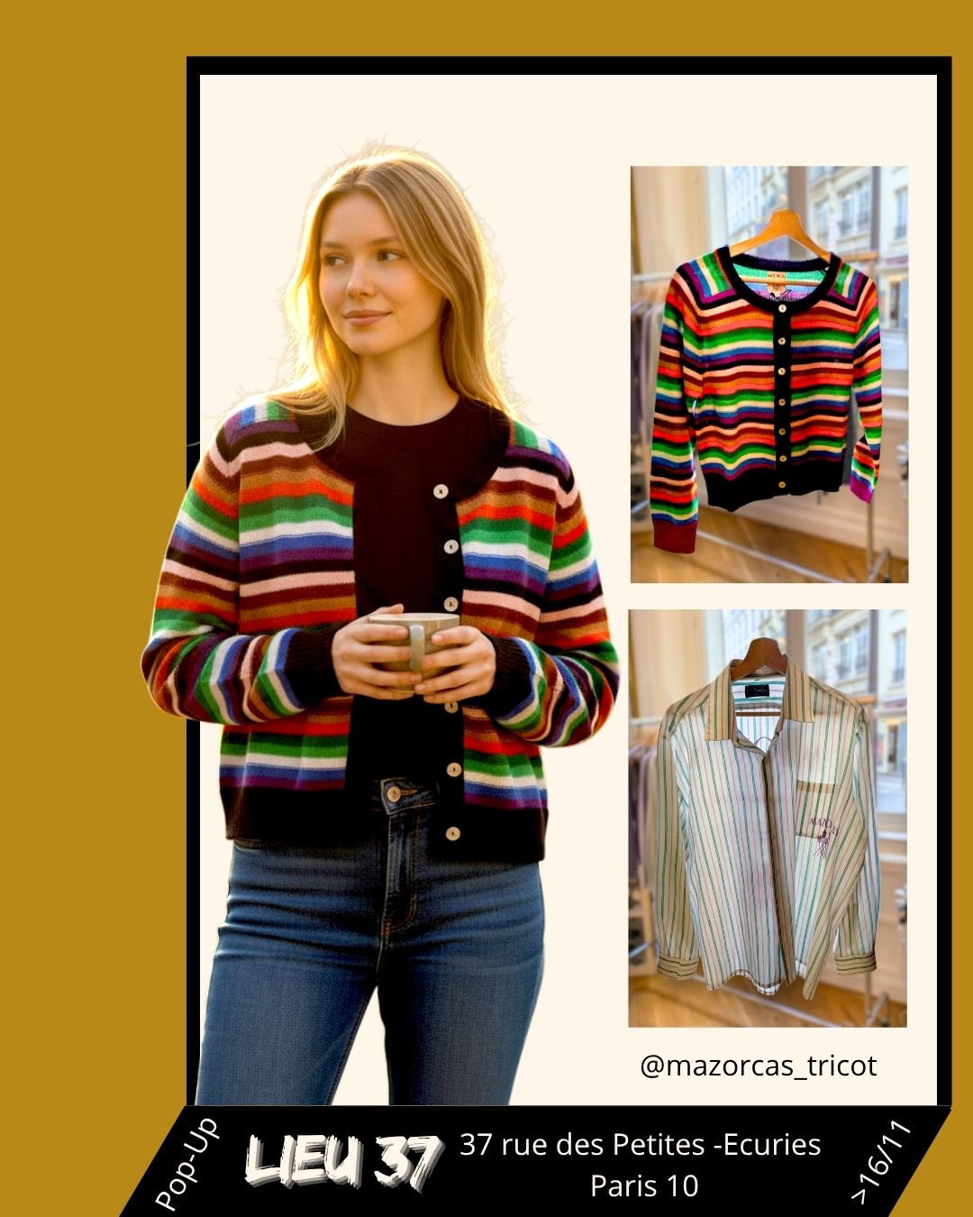 Mazorcas propose une maille légère, pour la journée ou le soir et l’accompagne d’une collection de Tshirt et une autre de chemises, provenant du vestiaire masculin ou féminin, qu’elle chine et auxquelles elle donne une seconde vie en les personnalisant avec des motifs en broderie ou en impression avec des histoires de rencontre et de bonne humeur.